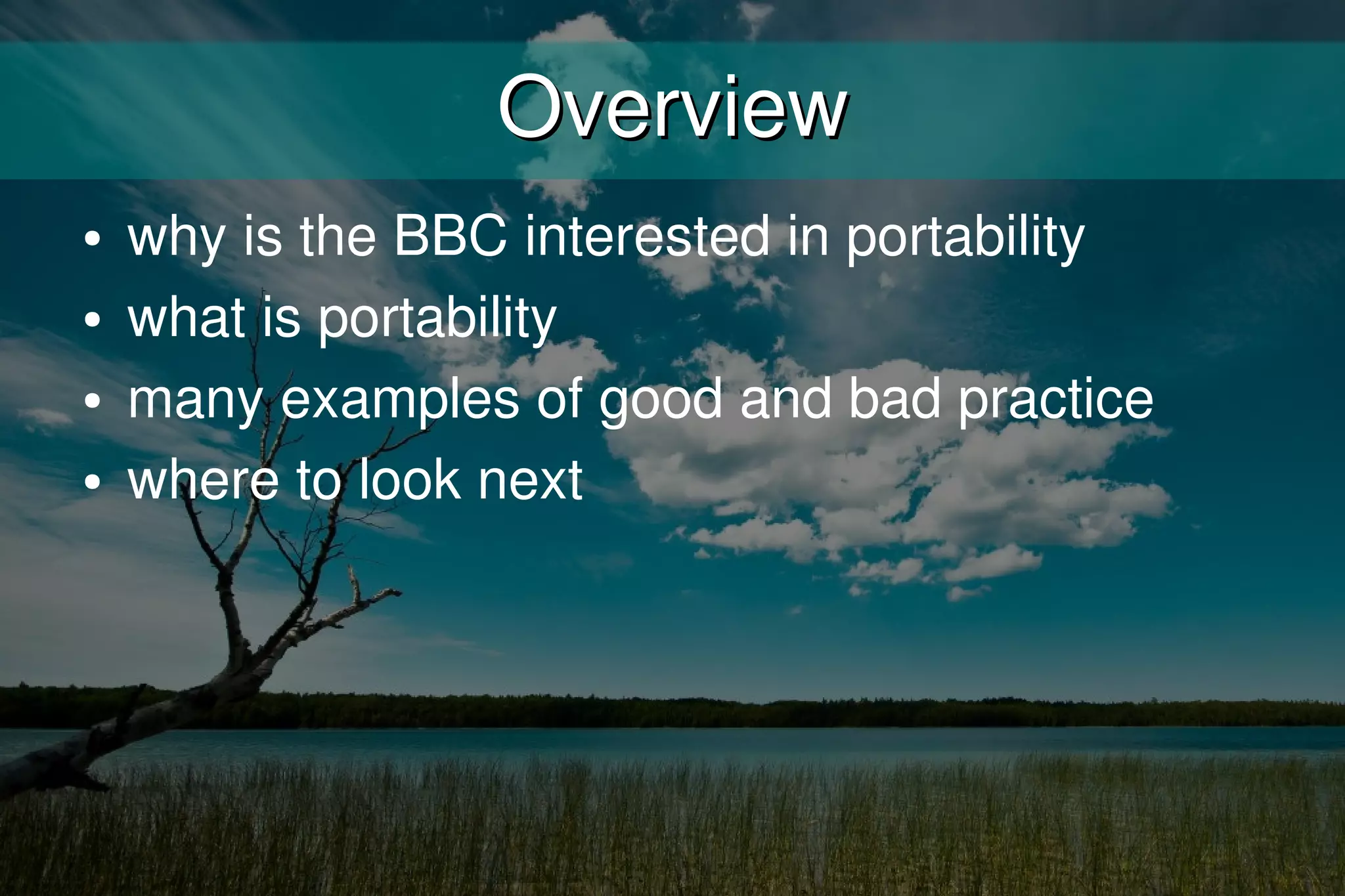 The document discusses the importance of data portability on the internet. It argues that users should have control over their personal data and be able to easily move it between services. This includes ownership of profile data, friend lists, and content created. Standards for open data formats and APIs are needed to allow users to more easily move data between platforms and not be locked into any single service. The document provides several examples of both good and bad practices around data portability and encourages moving toward more open models.