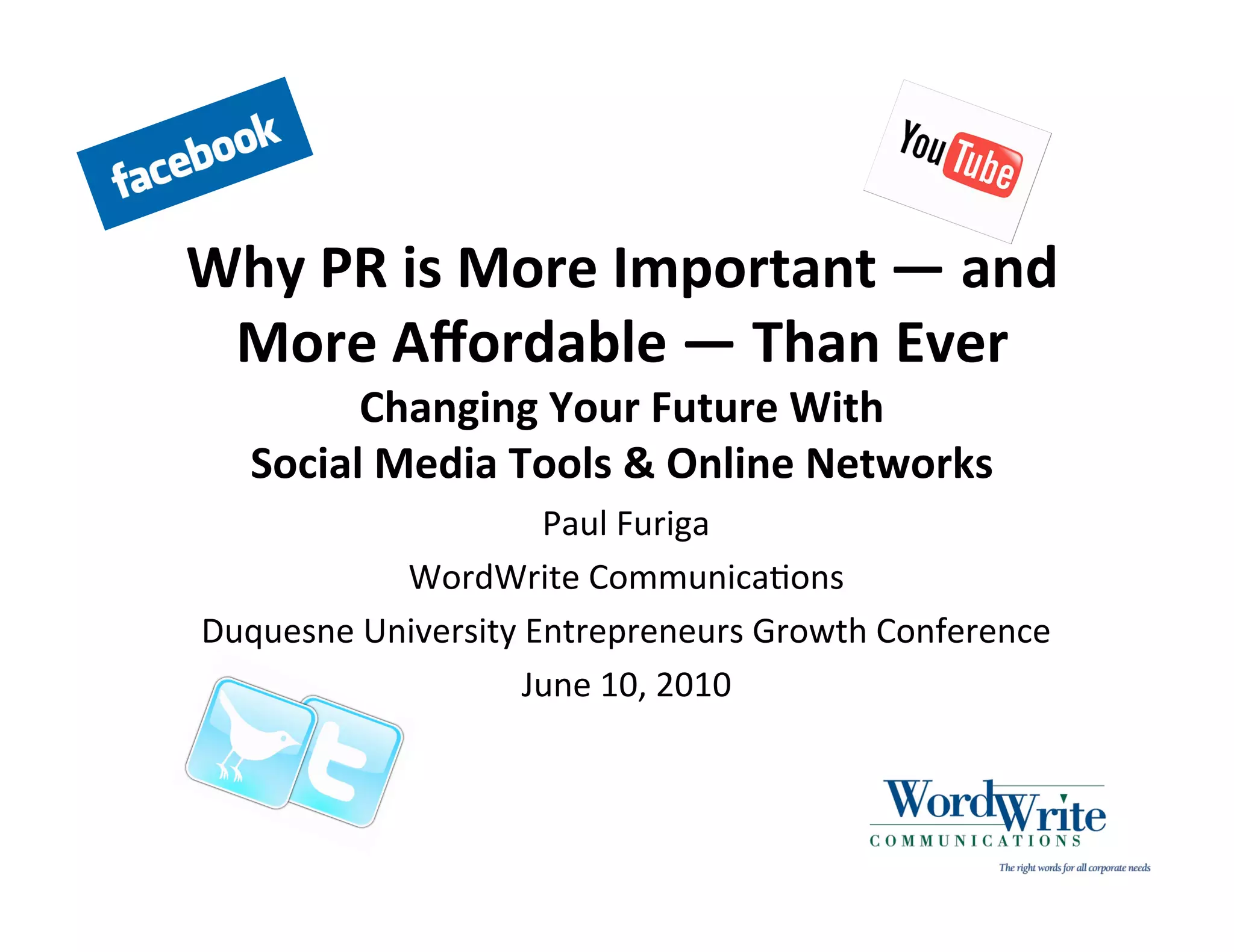 This document discusses the importance of public relations and social media. It argues that PR is more essential than ever in the digital age. Stories and storytelling are key to cutting through noise on social media. PR provides natural, organic exposure on social networks like having content shared is "baked right in" to search algorithms. The document provides tips on how to start using social media for PR, including researching relevant networks, listening, evaluating what audiences say about your company, designating social media staff, and sharing your business story to engage audiences. Examples from the author's clients using Facebook, Twitter and YouTube are presented. Social media reinforces PR principles like engagement and delivering results.