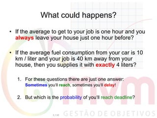 The document discusses the reasons why projects often miss deadlines, focusing on the 'bias of convergence' where the average time and resources lead to miscalculations of reaching targets. It suggests that instead of adding clearances for time and resources, they should be used to compensate for deviations, planning to achieve goals earlier to create a buffer. Ultimately, it highlights that around 70% of projects are delayed, indicating that better planning and understanding of variability is crucial for success.