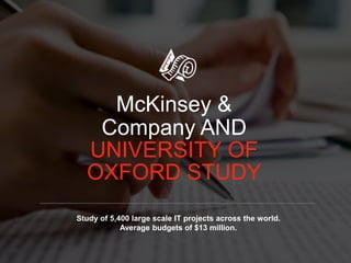 A study of 5,400 large-scale IT projects reveals that 70% of organizations experienced project failures, often due to poor decision-making, lack of clear goals, and unclear requirements. To improve project success, it's essential to define clear requirements, build effective teams, and adopt agile decision-making practices. Emphasizing a common vision and maintaining open communication can help organizations minimize project failures and maximize outcomes.