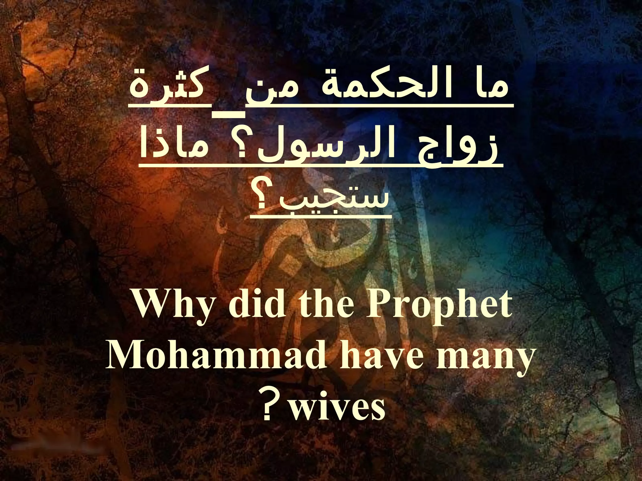 جاء هذا النص كإجابة على سؤال حول سبب تعدد زوجات النبي محمد، حيث تزوج 21 امرأة وله عشرة أزواج عند وفاته. يُفصل النص في الدوافع السياسية والاجتماعية والعائلية وراء هذه الزيجات، مثل تعزيز العلاقات مع الصحابة ونشر تعاليم الإسلام عبر أمهات المؤمنين، كما يوضح أن زواجه لم يكن مدفوعًا بالرغبة الجنسية. يتناول النص أيضًا الزواج بعبقرية منه في التعامل مع ظروف مجتمعه وتعزيز دور النساء في نشر العلم والدين.