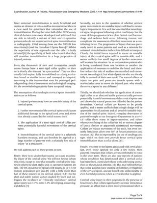 1) The document discusses the widespread practice of applying cervical collars to conscious trauma patients as a precaution for potential cervical spine injuries.