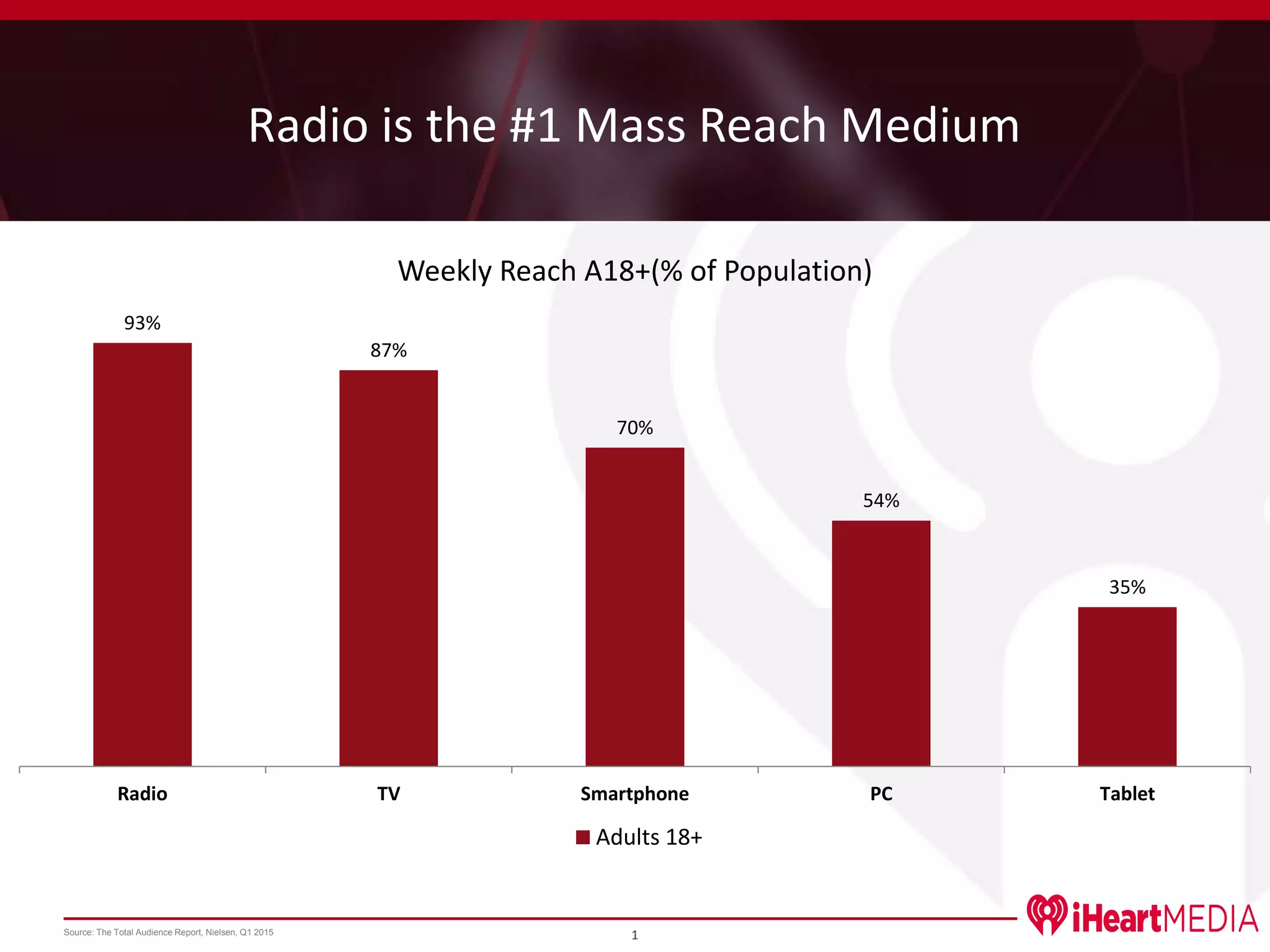 Radio has the highest weekly reach of any mass medium according to Nielsen's Q1 2015 Total Audience Report, being listened to by 93% of all US adults aged 18 and over. Radio also reaches more people than other mediums across all major age groups, including 93% of those aged 18-34 and 95% of those aged 50-64. It far surpasses other mediums like television, smartphones, PCs, and tablets in terms of weekly audience reach.