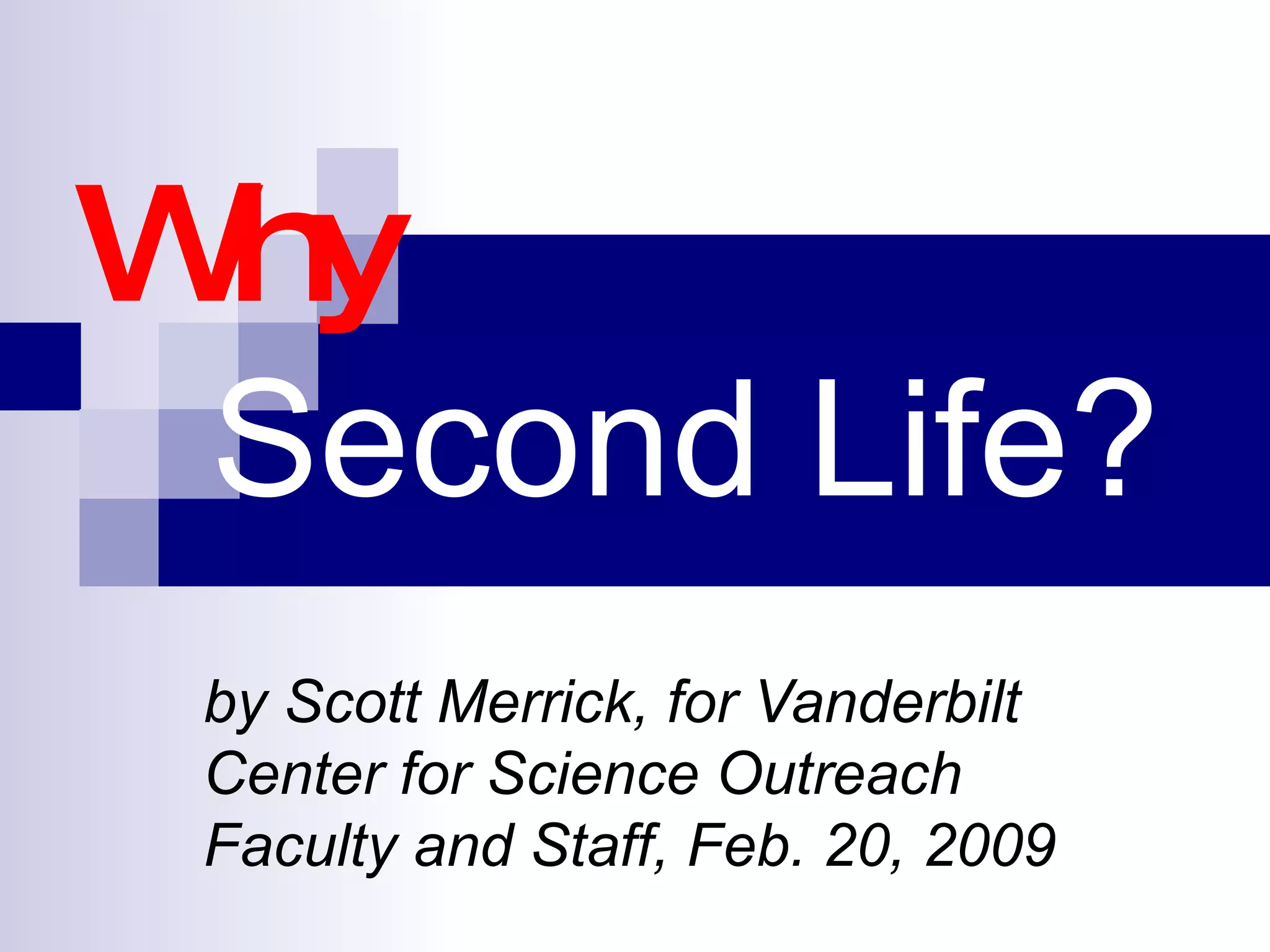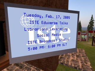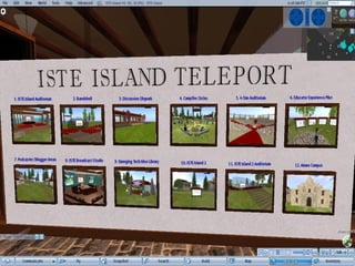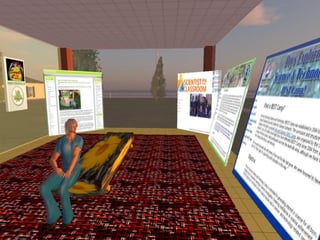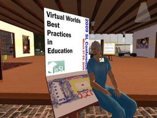 Second Life is a free online virtual world where users interact through avatars. It offers opportunities for engagement, learning, and connection that are difficult to achieve in the real world. Some benefits of using Second Life include more accessible interactions with experts, a sense of presence and place that enhances learning communities, and potentially lower costs compared to other online platforms through reduced rental rates. Educational institutions and organizations are increasingly establishing a presence in Second Life to take advantage of these opportunities.