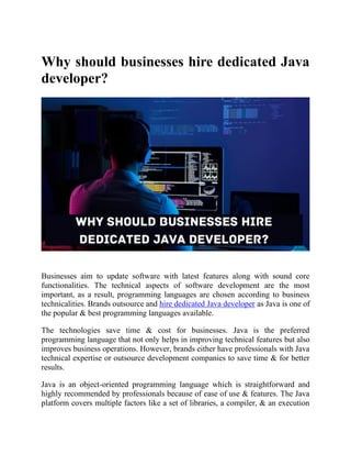 Businesses should hire dedicated Java developers to leverage the advantages of the Java programming language, which is known for its ease of use and technical features. Hiring skilled Java developers saves time and costs while improving software performance and core functionalities, leading to better branding and user experience. The document outlines the benefits of outsourcing Java development and provides steps for hiring top-rated development companies.