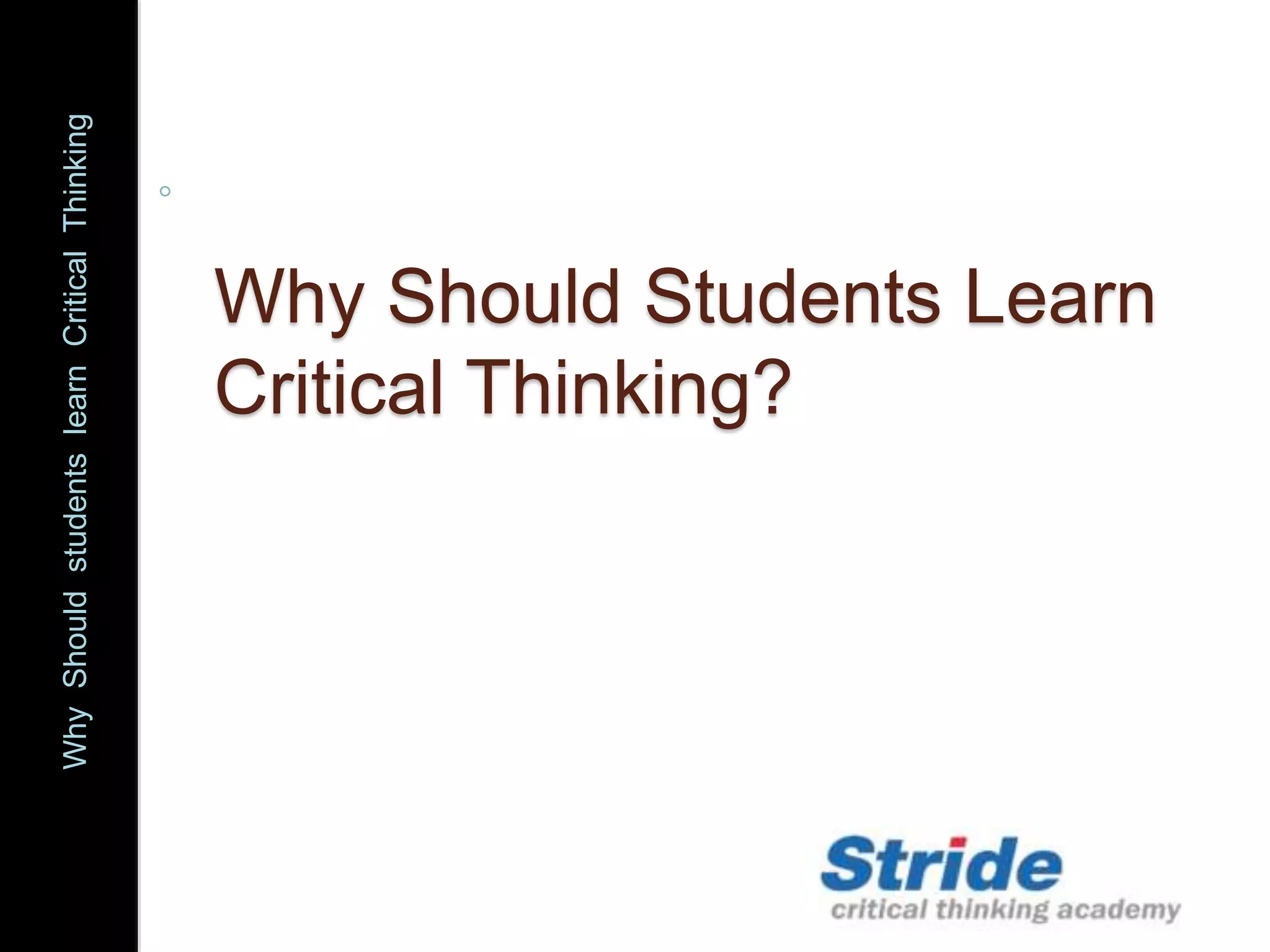 The document emphasizes the importance of critical thinking for students, highlighting its impact on learning, communication, decision-making, and performance in academic and professional settings. It outlines how critical thinking enhances essay writing, group discussions, and increases chances of employment by meeting employer expectations for problem-solving and reasoning skills. Overall, mastering critical thinking equips students with lifelong skills necessary for informed decision-making and effective problem resolution.