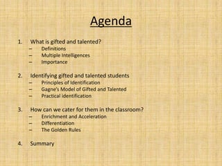 This document discusses gifted and talented students and how to identify and support them in the classroom. It defines giftedness using multiple definitions, including high intellectual ability and exceptional performance in specific areas. Teachers are encouraged to identify giftedness through early, ongoing communication with parents and prior teachers, using both objective and subjective methods. The document also describes different types of gifted students and strategies like enrichment, acceleration, and differentiation to engage and challenge gifted learners in the mainstream classroom.