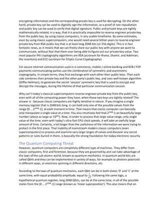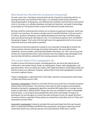 The document discusses the potential impact of quantum computing on current cryptographic systems, particularly in the realm of electronic payments, where trust and security are paramount. It explains how quantum computers could easily break existing asymmetric cryptographic algorithms like RSA and ECC, posing a significant threat to financial security. The author emphasizes the urgency for the financial industry to engage with quantum computing experts to prepare for this impending shift and ensure a transition to quantum-safe encryption methods.