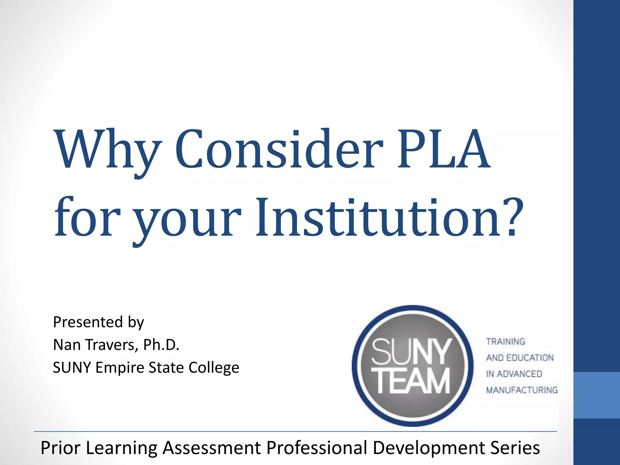 This document discusses the benefits of prior learning assessment (PLA) for higher education institutions. It notes that PLA can help institutions meet President Obama's goal of increasing the number of college graduates by 2020 by allowing students to earn credit for knowledge gained outside the classroom. Research shows PLA participants are over twice as likely to complete degrees and do so more quickly. PLA benefits institutions by recruiting students with advanced standing, reducing costs, improving retention, strengthening partnerships with employers, and allowing competency-based assessment. The document advocates for PLA as a way to help institutions, students, and the broader degree completion agenda.