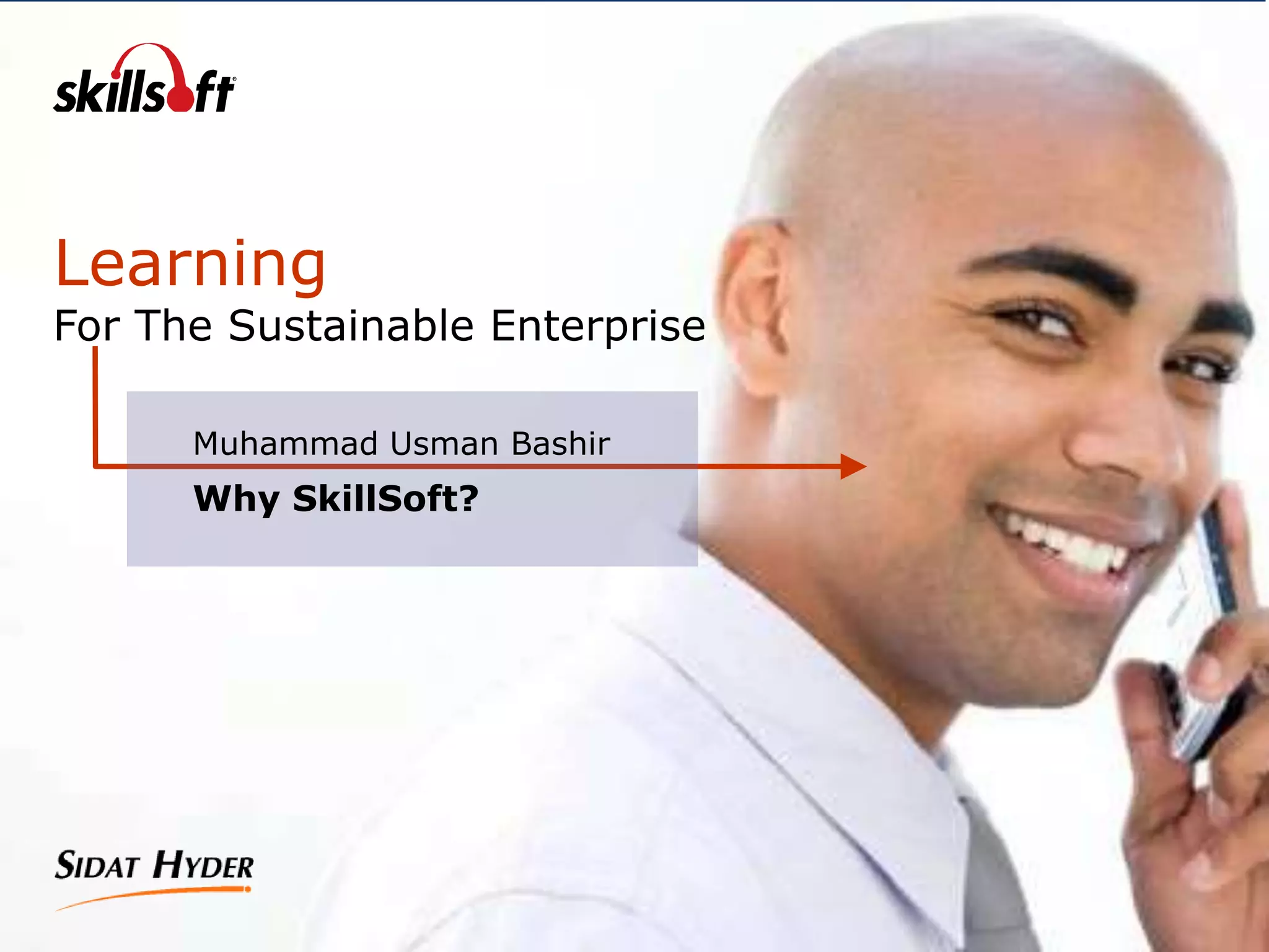 This document discusses the role of learning in the sustainable enterprise. It argues that learning can maximize the value of people, prepare for the unexpected, and do more with less. Specifically, learning can improve organizational performance, increase agility and productivity, and reduce costs. It expands access to learning through any time, any place options. SkillSoft is presented as a learning partner that can help achieve these goals through its experience and stability, customer focus, and commitment to learning innovation as demonstrated through its history of developing new learning technologies and solutions.