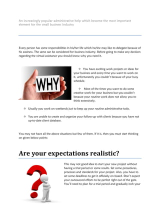 Small businesses benefit from virtual assistants because VAs can help complete routine administrative tasks more efficiently, freeing up time for business owners to focus on creative projects. Some tasks well-suited for outsourcing include lead generation, social media management, and responding to routine emails. When hiring a VA, businesses should take time to define tasks, screen candidates, conduct interviews, and have a trial period to ensure proper fit.