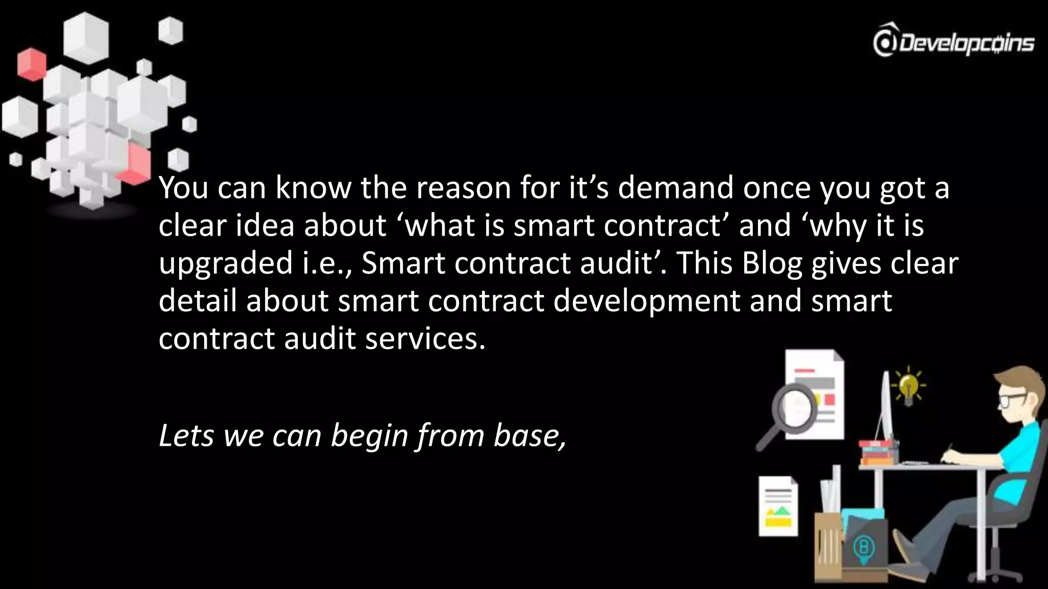 The document explains the concept and demand for smart contract audit services, highlighting the importance of smart contracts as self-executing agreements between parties. It emphasizes that smart contract audits are necessary due to the technology's complexity and associated risks, leading to a high market demand for such services. The text recommends seeking experienced smart contract development companies for reputable auditing services.