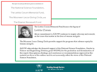 The document discusses reasons for the underrepresentation of women in science, technology, engineering, and mathematics (STEM) fields. It identifies three key areas that shape girls' and women's achievement and interest in these fields: social and environmental factors, the climate of university STEM departments, and the influence of implicit bias. The document provides research findings on how stereotypes, mindsets, spatial skills training, and work-life balance policies can impact gender disparities in STEM.