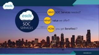 The document discusses the necessity of Security Operations Center (SOC) services in response to increasing cyber threats, emphasizing the evolution of cybersecurity from a luxury to a necessity for organizations. It highlights the offerings of ESDS' SOC services, including cost-effective, subscription-based models that provide 24/7 monitoring and management of security functions, aiming to protect organizations from potential cyber threats. Additionally, the document showcases ESDS's experience, industry recognition, and certifications, reinforcing its credibility as a trusted provider in the cybersecurity landscape.