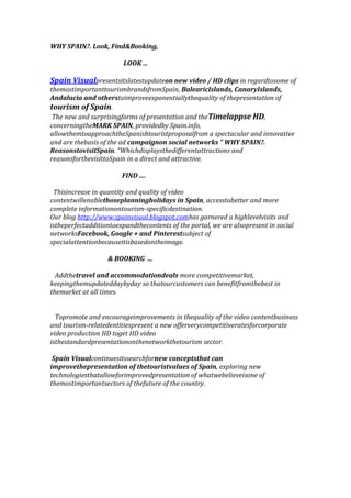 Spain Visual has updated its portal with new high-definition video clips highlighting some of Spain's most important tourism brands, including the Balearic Islands, Canary Islands, and Andalusia. The new time-lapse videos produced by Spain.info allow users to explore Spanish tourism in a spectacular and innovative way as part of a social media campaign promoting reasons to visit Spain. This increased video content will enable travelers to better plan their holidays in Spain. The company also offers competitive travel and accommodation deals that are updated daily to benefit customers. Spain Visual continues working to improve presentation of Spain's tourist values through new technologies.