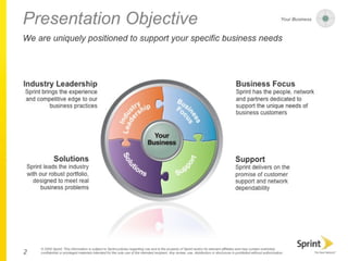 #2 Creation / Last revision: 14 April 2009 Audience: New and Existing Enterprise customers Purpose of this presentation: Purpose is two fold: Provide an outline for our sales teams to talk with customers about their needs and how Sprint can uniquely meet those needs – with a clear, consistent message about our Sprint differentiators. And then also to provide a one stop shop for sales to deliver the latest Sprint messaging and key points. It’s separated into 3 sections: a main introduction and two appendices # of Slides: 56 Script: A full script is included, which provides key talking points. Click on Notes Page to view. FOR INTERNAL USE ONLY. For question, comments or input: [placeholder]