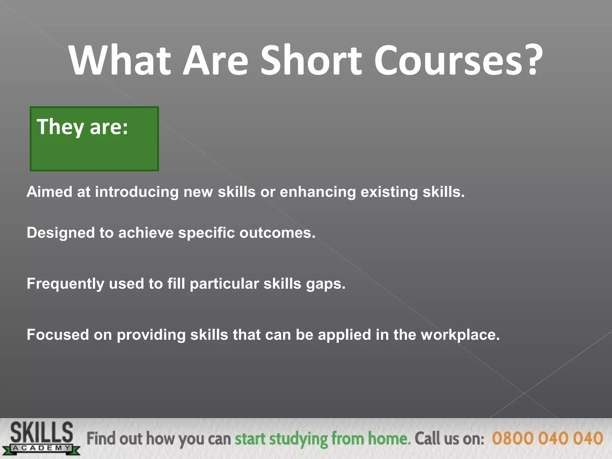 Short courses aim to introduce new skills or enhance existing ones in a focused way to fill particular skills gaps. They are designed to achieve specific outcomes and be applicable in the workplace. Distance learning allows one to complete short courses from anywhere through online academic support. The main advantages are flexibility to work at your own pace without taking time off or incurring travel costs. One should choose courses that address skills needed for their current or future jobs. Short courses provide formal certification and allow one to improve skills for career advancement in a short time period.