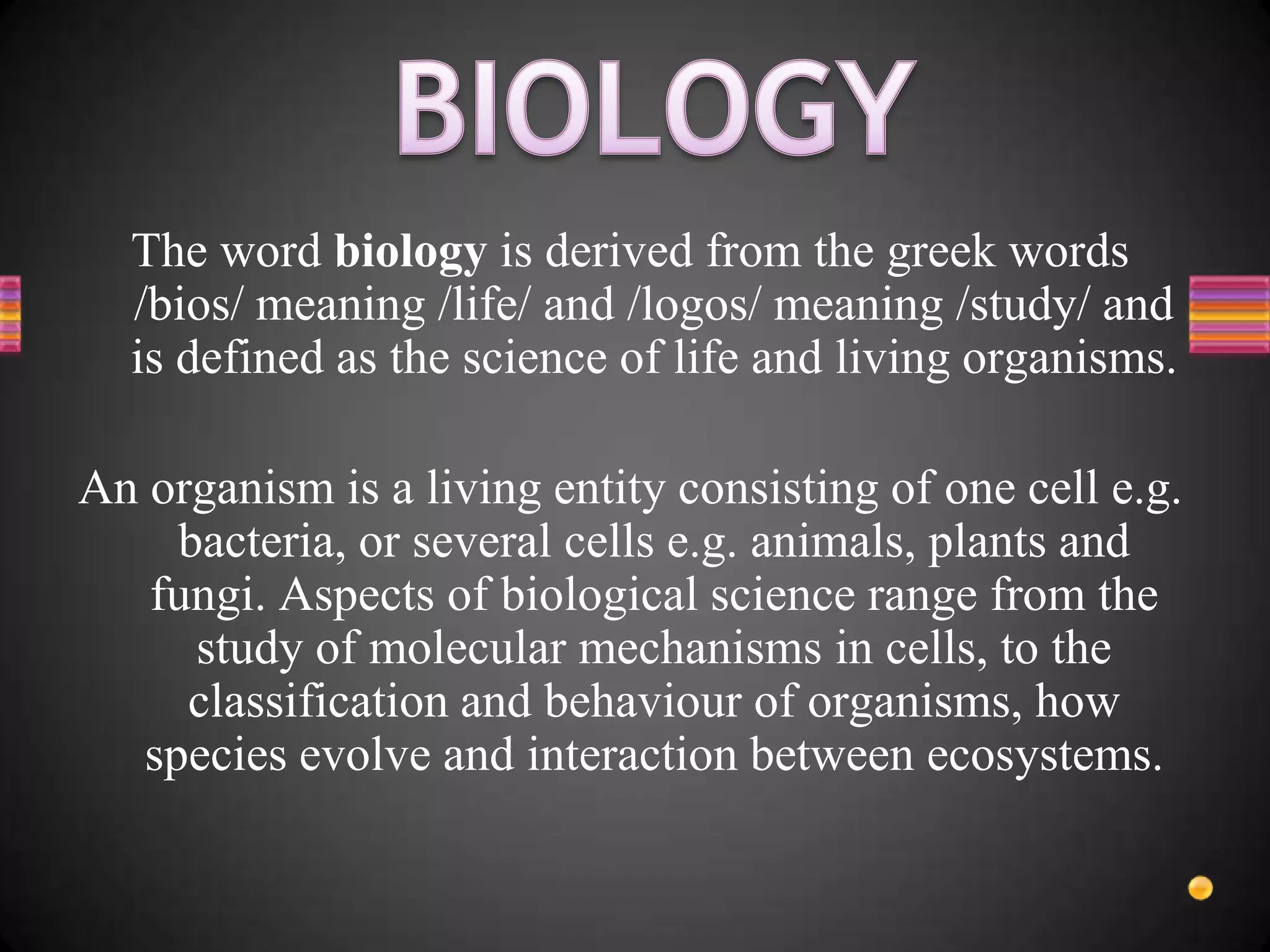 Biology is the study of life and living organisms. It involves studying everything from molecular mechanisms within cells to the classification and behavior of organisms and how species evolve and interact within ecosystems. There are many fields of study within biology, including zoology, botany, microbiology, ecology, anatomy, biochemistry, morphology, physiology, biotechnology, and medicine. The study of biology helps us understand ourselves, our behavior, how our bodies work, how we are related to other organisms, and the world we live in.