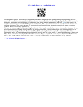 Why Study Ethics in Law Enforcement discusses how law enforcement professionals should study ethics to prepare them for difficult choices they may face in their careers. Ethics can be defined as determining moral duties. Studying ethics exposes officers to situations they may encounter and helps prevent unethical actions that could occur when under stress. The nurse example shows how understanding ethics can help analyze situations to prevent issues like unlawful arrests. Overall, studying ethics is important for law enforcement to handle situations properly and uphold their duties in a moral manner.