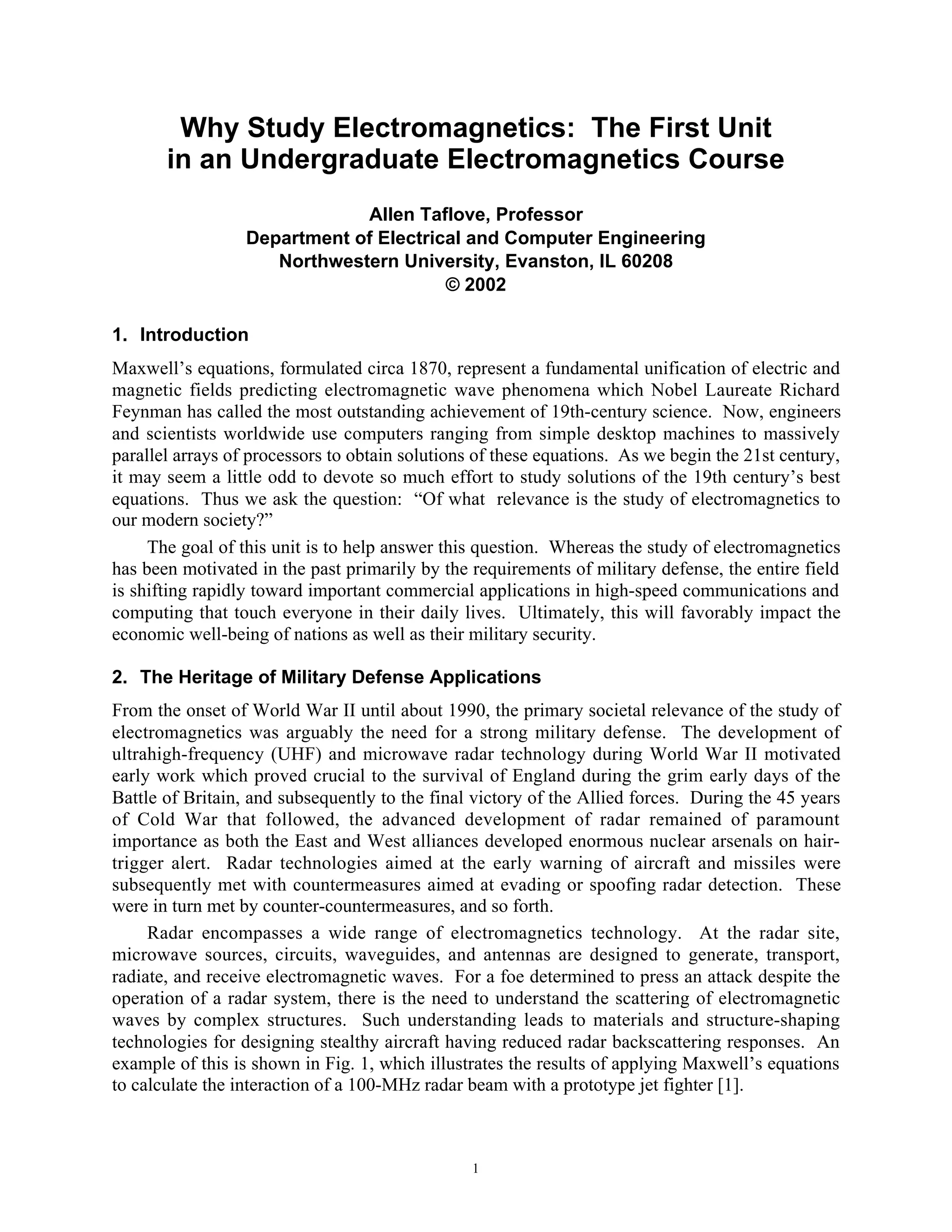 This document discusses the relevance of studying electromagnetics in modern society. It begins by discussing how electromagnetics was primarily motivated by military defense applications such as radar technology. It then describes how electromagnetics is now crucial for high-speed electronics, photonic integrated circuits, microcavity laser design, and controlling ultrashort optical pulses. Computational solutions of Maxwell's equations are essential for effectively designing technologies across these applications.