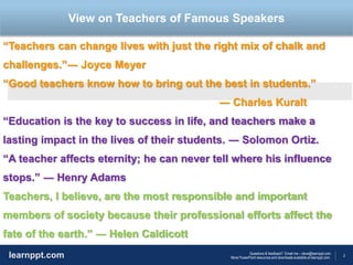 Teaching is the most important profession because teachers have the ability to profoundly influence students and shape their futures. Several studies have shown that teachers have significant impacts on student achievement, attendance at college, future earnings, and other life outcomes. Good teachers can improve student performance while poor teachers can negatively affect students. The work of teachers is crucial for building the next generation and developing the leaders and workforce of the future.