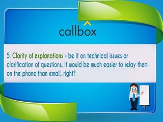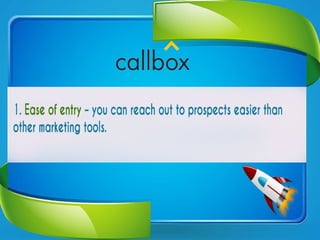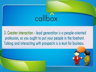 The document discusses the advantages of telemarketing as a method for generating sales leads amidst evolving marketing tactics. It emphasizes that telemarketing should be reconsidered as an effective medium for businesses. The document also encourages readers to explore additional telemarketing and lead generation tips available on the Callbox Sales and Marketing blog.