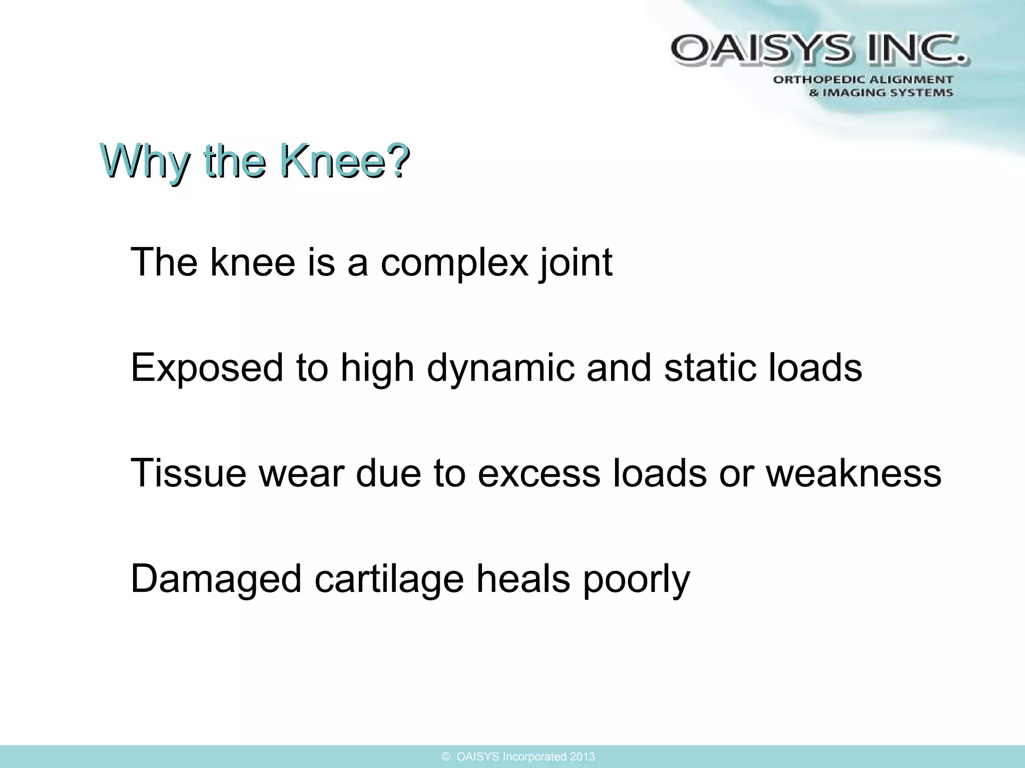 The knee is a complex joint that is exposed to high loads and susceptible to tissue wear from excess loads or weakness as damaged cartilage in the knee heals poorly. The knee consists of cartilage surfaces that glide against each other, menisci that act as mobile gaskets, and bones, ligaments, and muscles that provide support and attachments.