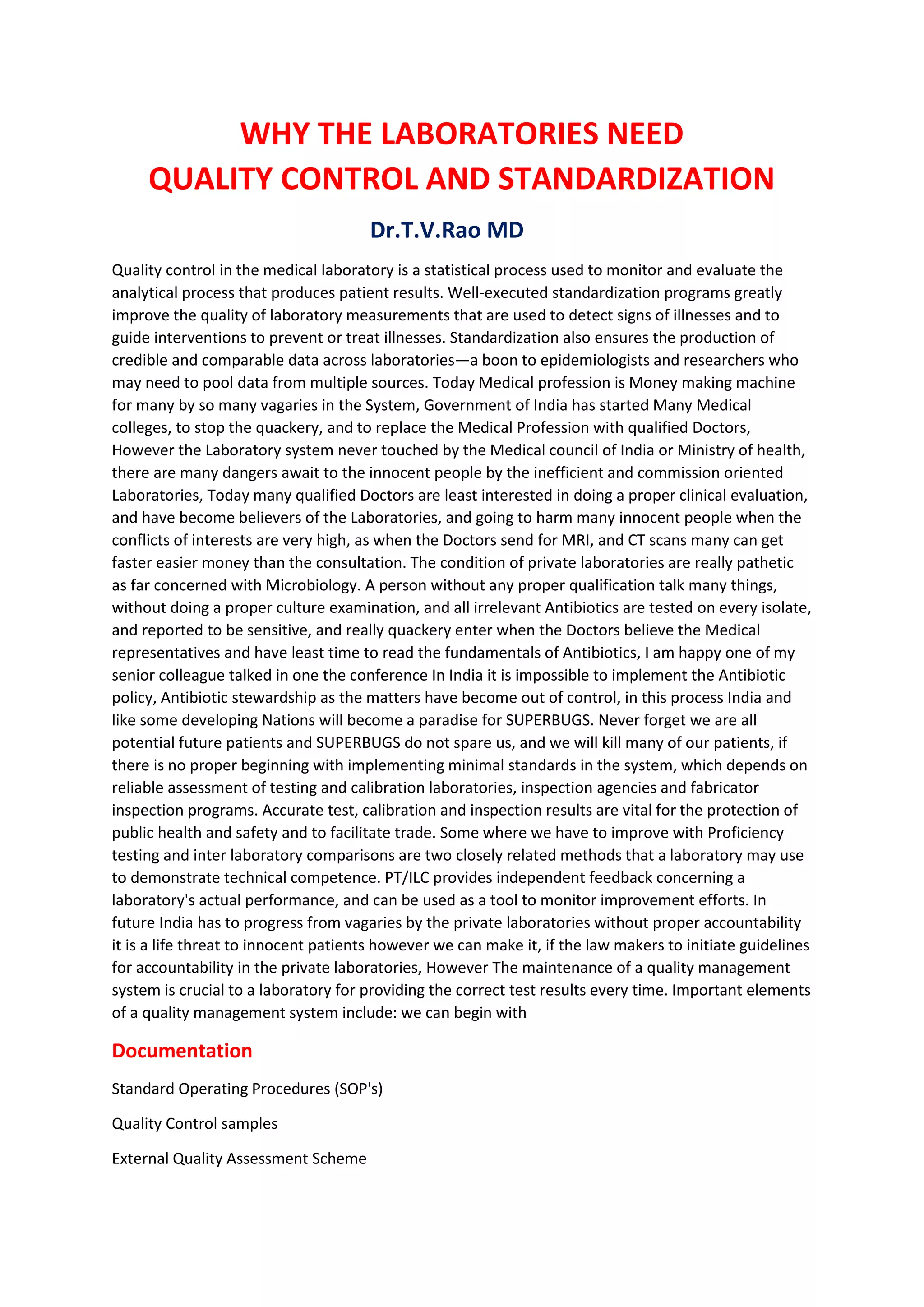 Standardization and quality control in medical laboratories are essential to ensure accurate test results and credible data. Laboratories need to implement procedures like documentation, standard operating procedures, quality control samples, and external quality assessment to reliably monitor testing and calibration. Achieving quality requires tools like procedure manuals, maintenance schedules, calibrations, training, and quality control. The current state of many private laboratories in India is problematic, as testing and reporting of bacteriological cultures is often done without proper qualifications, leading to inaccurate reporting of antibiotic sensitivity and a risk of increasing antibiotic resistance. Regulations and accountability are needed to improve standards in medical laboratories.