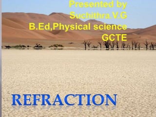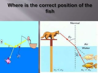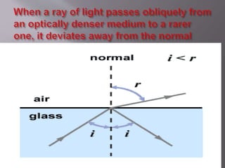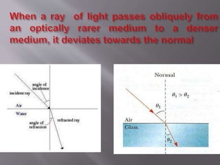 When light passes from one medium to another at an angle, it bends due to the change in speed. The amount of bending, or refraction, depends on the optical density of the materials, with less dense materials like air bending light less than denser materials like water, glass, and diamond. Common examples of refraction include objects like spoons appearing bent when in water, fish appearing higher than their actual position, and the sun appearing to rise and set later than it actually does.