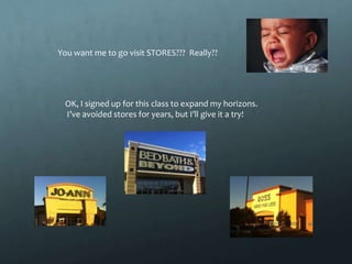 The document summarizes the author's experience visiting different types of stores. It notes that high-end stores have attentive salespeople but no opportunity to take photos, clean displays, seating, and refreshments. Lower-end stores have better prices but poorly organized merchandise and large, harsh spaces. The author prefers shopping online from home where they have control over music, refreshments, and easy access to options without crowds. They acknowledge the assignment was meant to provide insights but they did not gain much from the store visits.