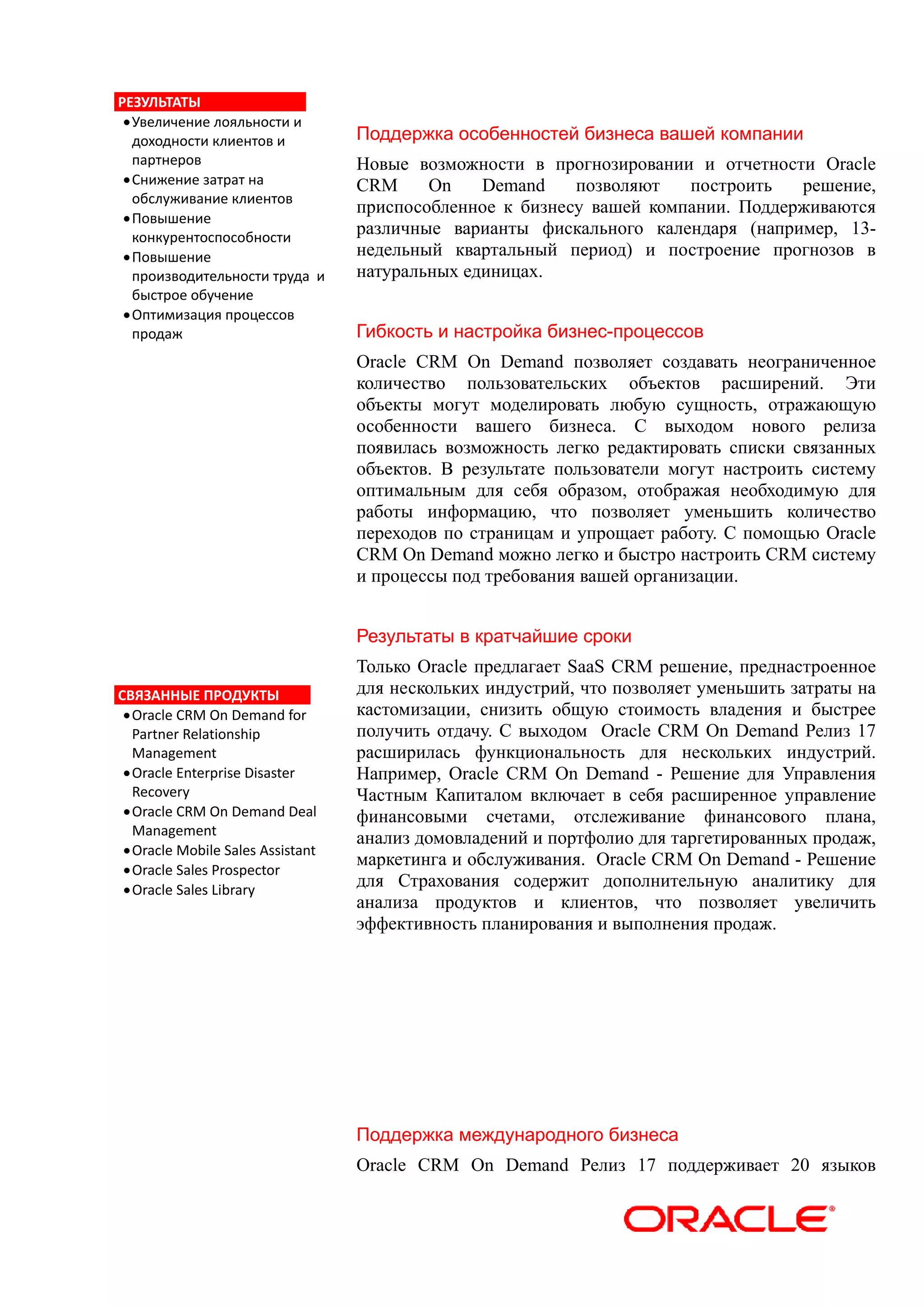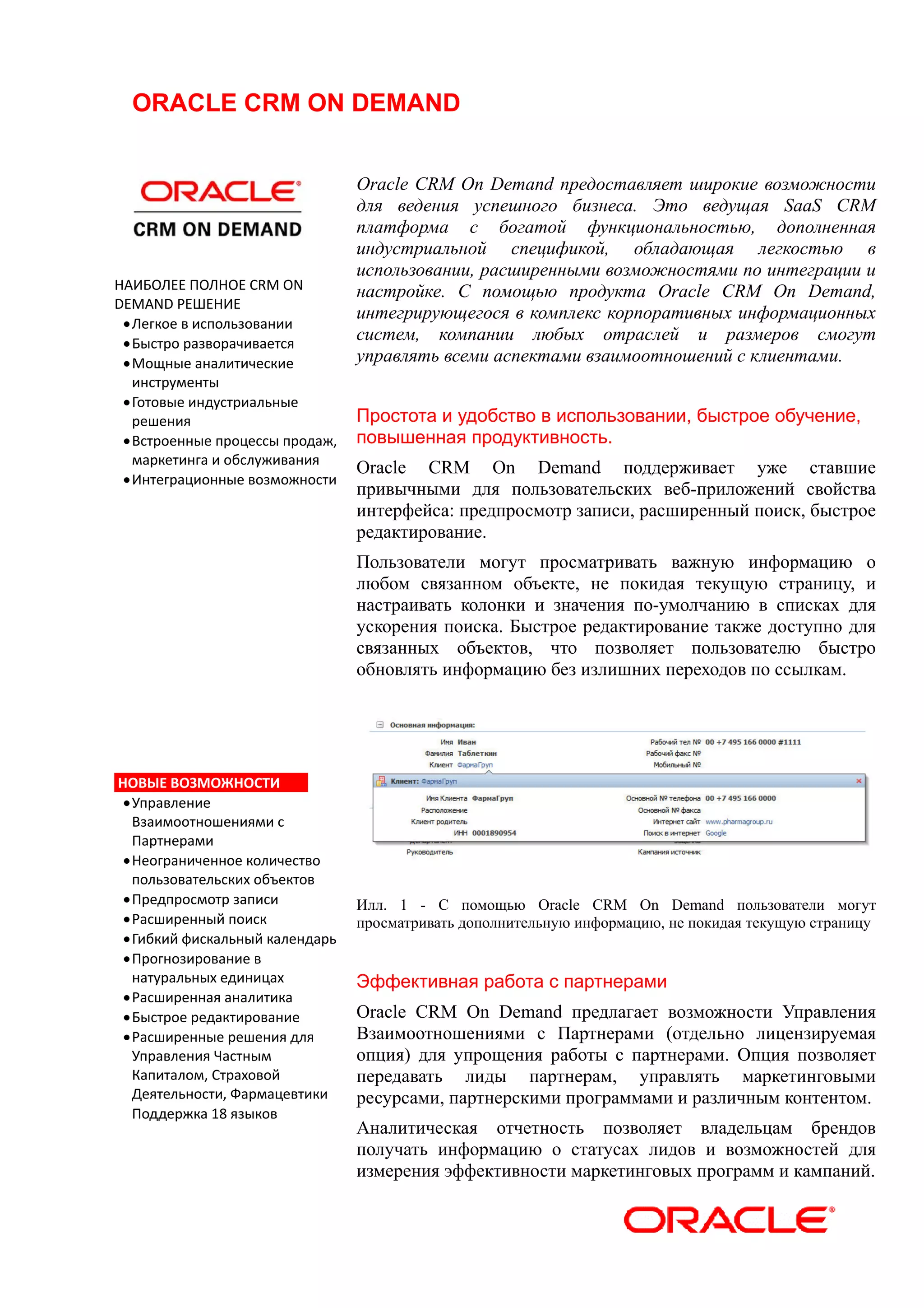 Oracle CRM On Demand - это мощная SaaS-платформа для управления взаимоотношениями с клиентами, предлагающая обширные функции, включая аналитические инструменты и интеграцию с корпоративными системами. Платформа поддерживает многоязычность и предоставляет возможности для настройки под индивидуальные потребности бизнеса, что повышает продуктивность и снижает затраты на кастомизацию. Кроме того, она предлагает управлению партнерами и глубокую аналитику для оптимизации маркетинговых программ и обслуживания клиентов.