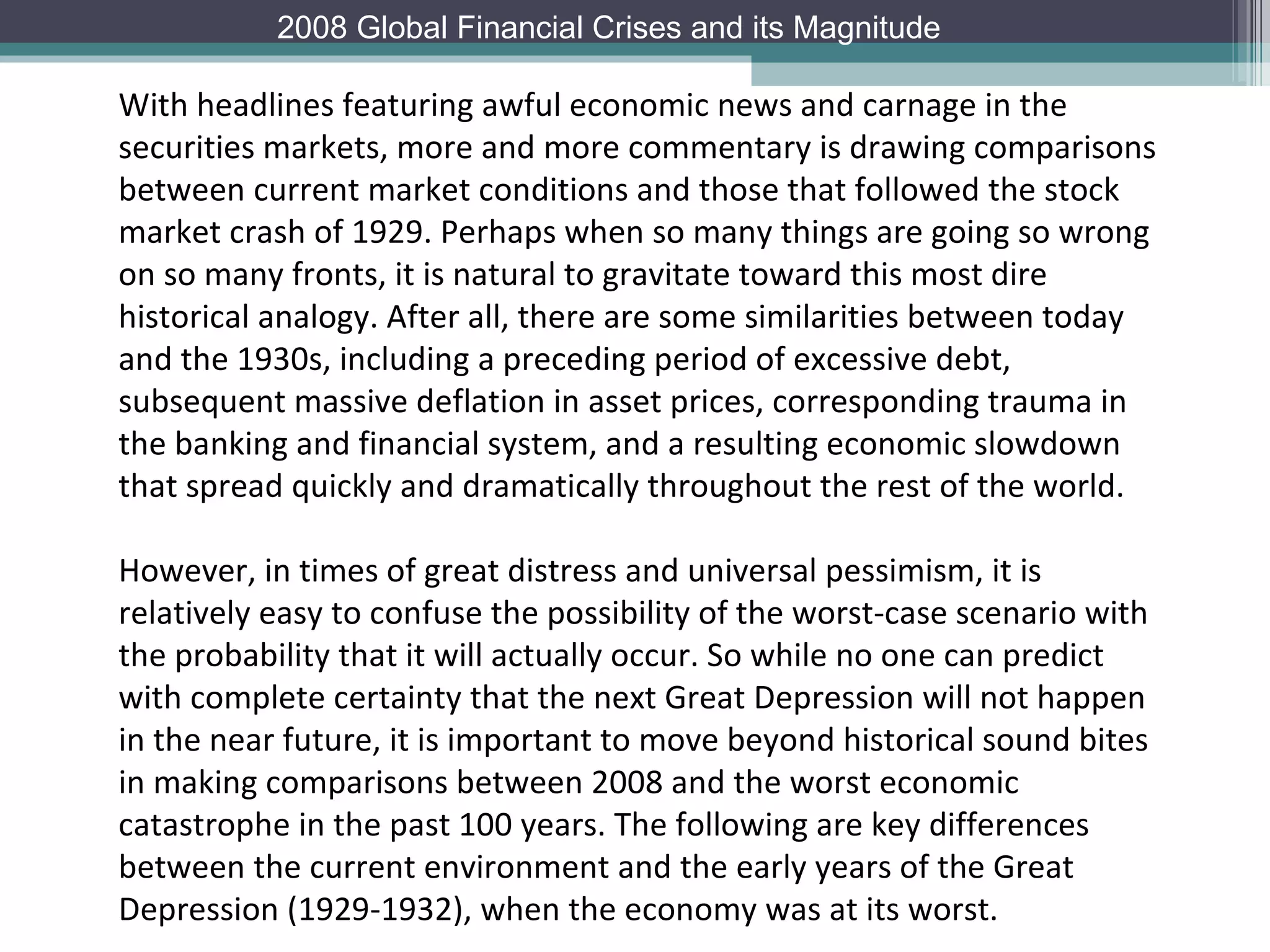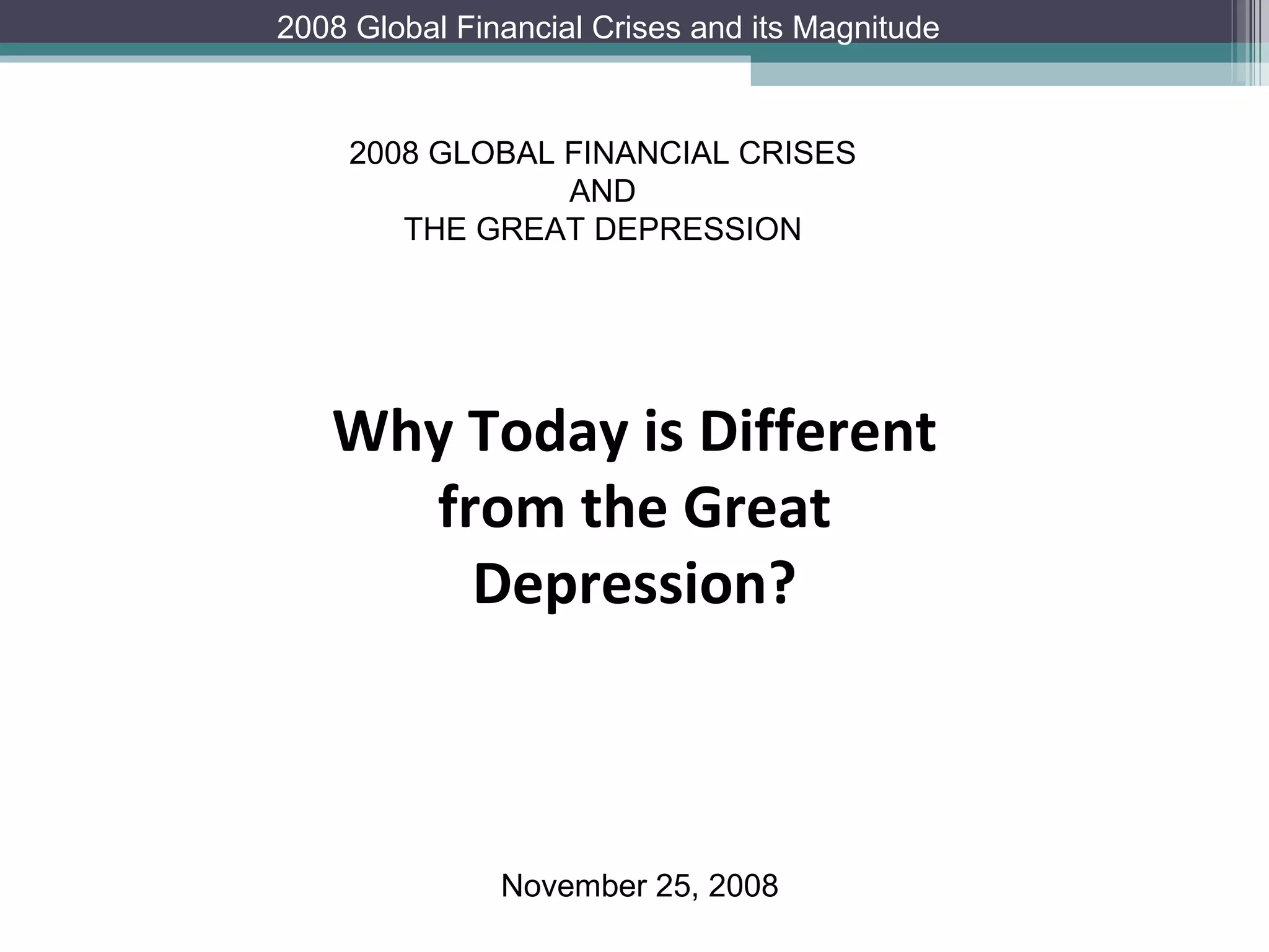 While there are some similarities between today's financial crisis and the Great Depression, such as excessive debt and asset price deflation, there are also key differences: