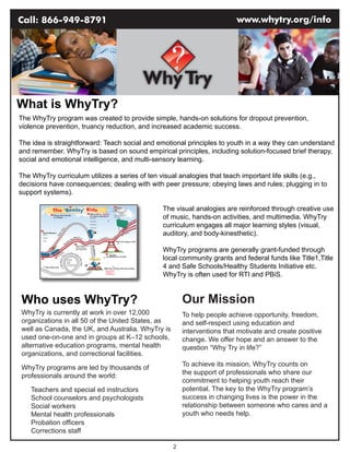 WhyTry is an evidence-based program that uses visual analogies, music, hands-on activities and multimedia to teach important life skills to youth. It aims to motivate unmotivated youth and help reduce dropout rates, bullying, drug use and improve academics. The WhyTry curriculum contains 10 visual metaphors reinforced through group activities to engage different learning styles. It has been used in over 12,000 schools and organizations worldwide.
