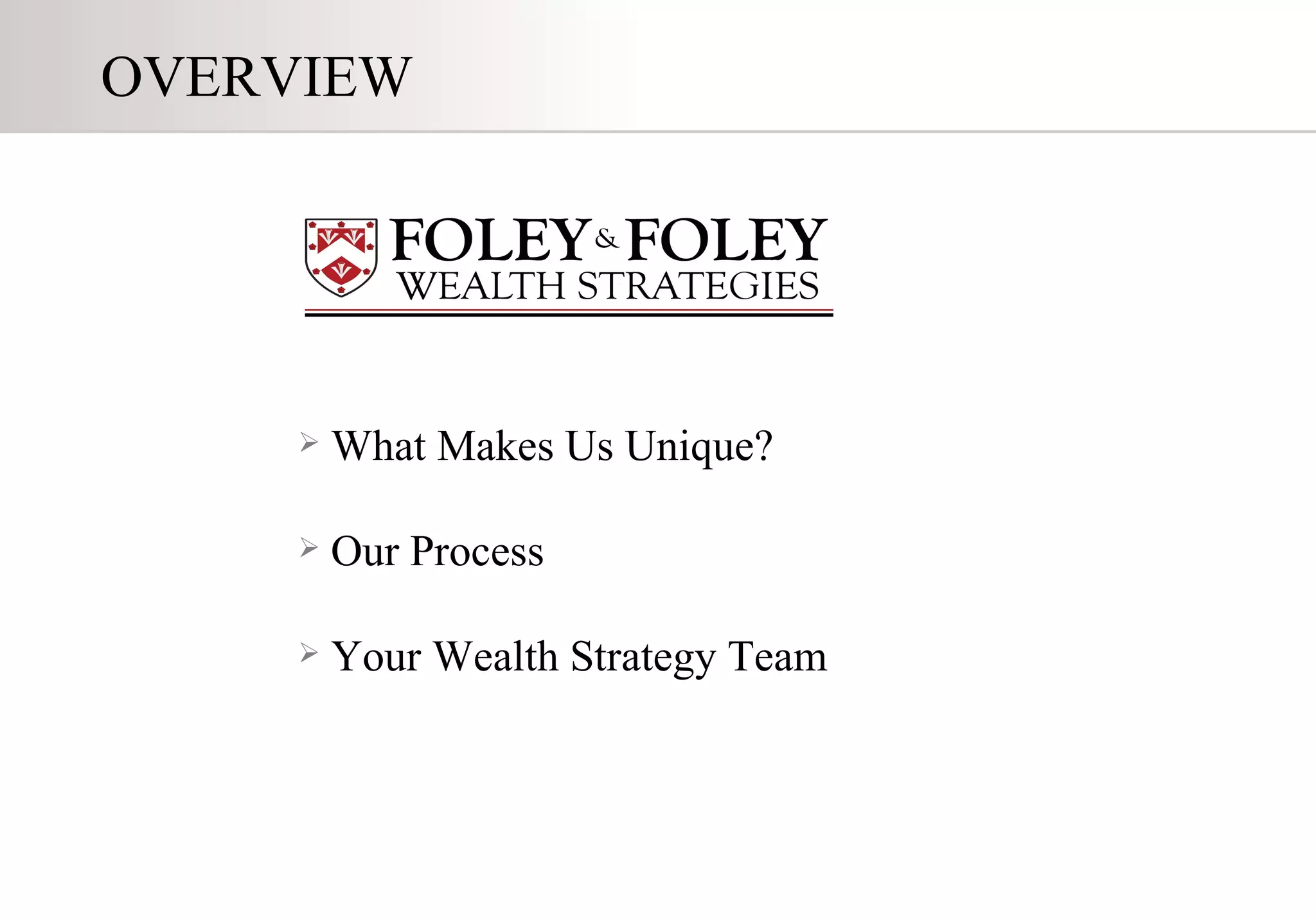 This document outlines the financial planning process of Foley & Foley Wealth Strategies. It discusses their mission to provide comprehensive financial advice to build, manage and preserve client wealth. Their approach involves a team-based analysis of all aspects of a client's financial life. Their objective is to accomplish their mission profitably while giving back to the community. The document then describes their three stage financial planning process of analysis, portfolio construction, and education/communication with clients.