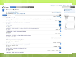 This document discusses how social bookmarking services like Delicious allow users to save web pages and articles to read later from any device, making bookmarks portable. It suggests using Delicious as a way to showcase the types of content one is reading to others and potentially increase one's perceived intelligence. Delicious is also proposed as a method for websites to have an automatically updating "What's New" section by saving alerts from services like Google or Radian6.
