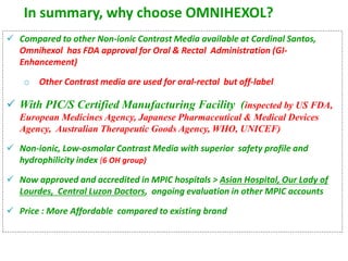 Omnihexol is a non-ionic, low-osmolar contrast media approved for oral and rectal administration for GI enhancement, unlike other contrast media which are only used off-label for these routes. It is manufactured in a PIC/S certified facility inspected by major regulatory agencies. With a superior safety profile and hydrophilicity due to its 6 OH groups, Omnihexol is more affordable than existing brands and is now approved in several MPIC hospitals with ongoing evaluations in other accounts.
