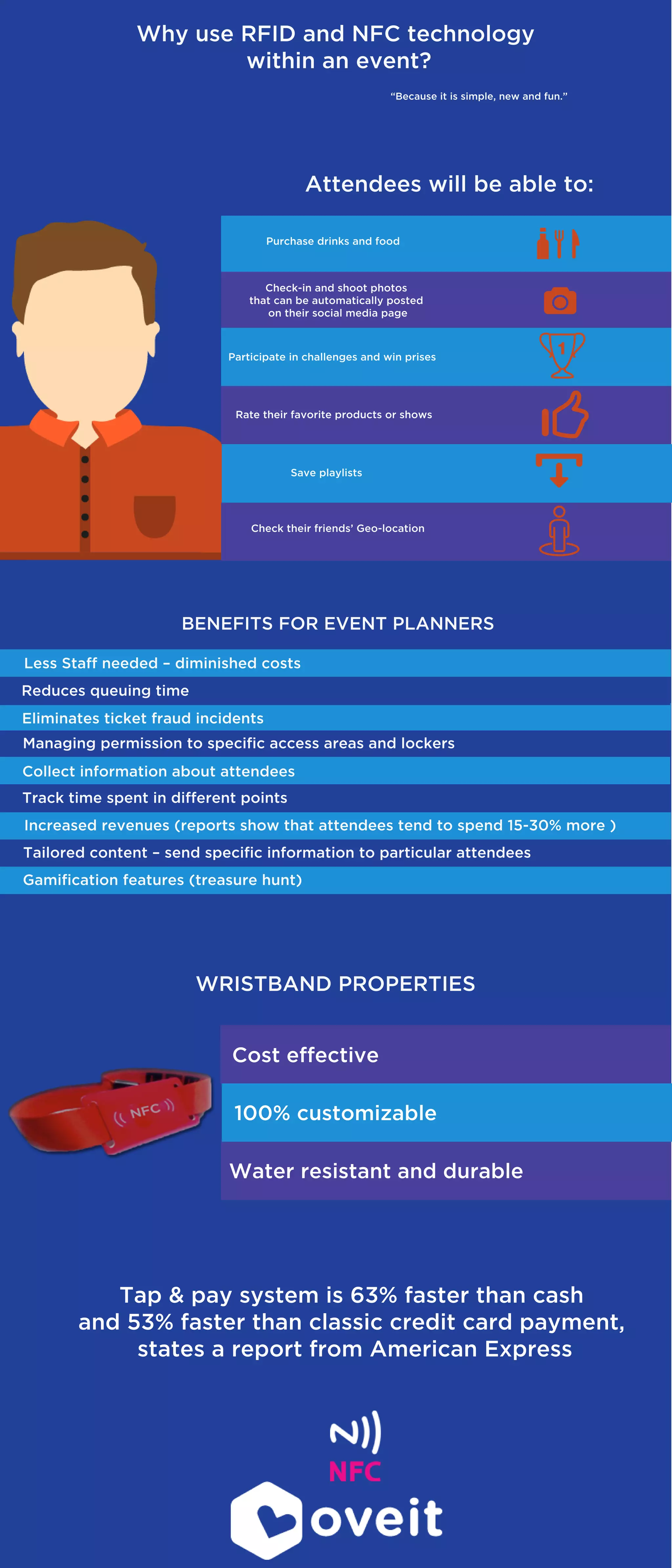 The document discusses the benefits of using RFID and NFC technology at events, highlighting its simplicity and fun factor for attendees. Key advantages for event planners include tailored content delivery, increased revenues, reduced staffing costs, and enhanced attendee engagement through features like gamification and geo-location tracking. Additionally, the technology improves payment efficiency, reduces ticket fraud, and allows for better data collection on attendee behavior.