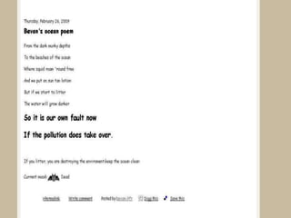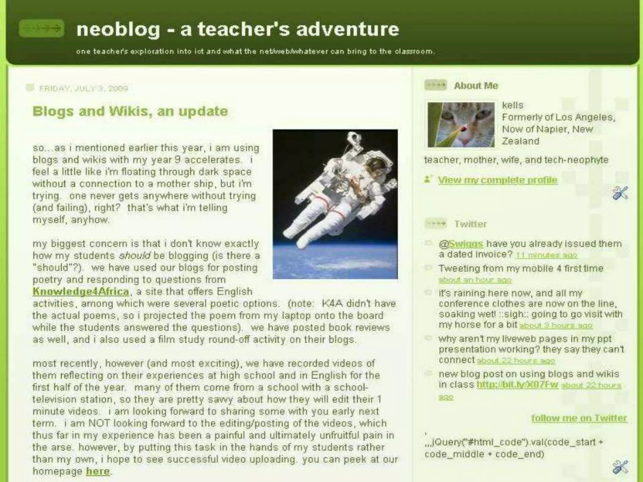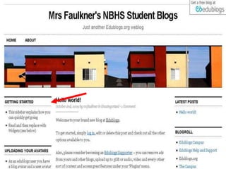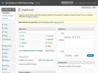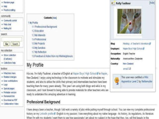 Kelly Faulkner presents on using wikis and blogs in the classroom. Wikis allow for collaborative learning and make it easy to monitor student work and participation. They encourage communication between students, teachers, and parents. Blogs are good for student reflection, e-portfolios, communication, and teaching digital literacy and online ethics. Faulkner provides examples of wiki and blog platforms that can be used and urges teachers to start using these technologies now to empower learning.