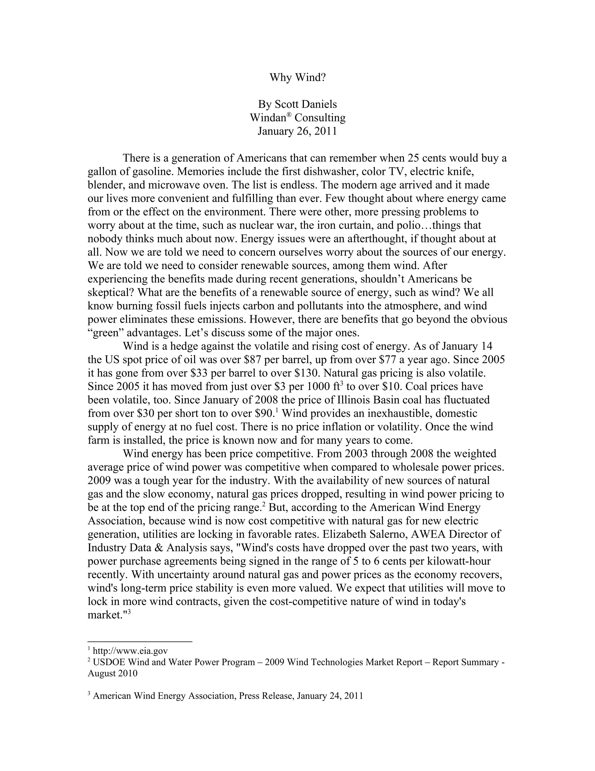 The document discusses the benefits of wind energy as a renewable energy source. It notes that wind power provides a stable, domestic source of energy without fuel costs and price volatility. While wind energy was initially more expensive than other sources, its costs have decreased and it is now competitive with natural gas. Wind farms also provide local economic benefits through job creation and increased tax revenue. While wind energy faces challenges in infrastructure costs and needing backup power sources, it remains a clean and competitive alternative to help meet America's energy needs.