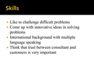 Qiting Yang has strong skills in problem solving, innovative thinking, and speaking multiple languages. She has a Bachelor's degree in Management Information Systems and Analytical Consulting from Purdue University with honors. She interned at KPMG where she assisted with audit reports and evaluated clients' financial controls. She also tutored accounting courses and led relief efforts after Hurricane Katrina.