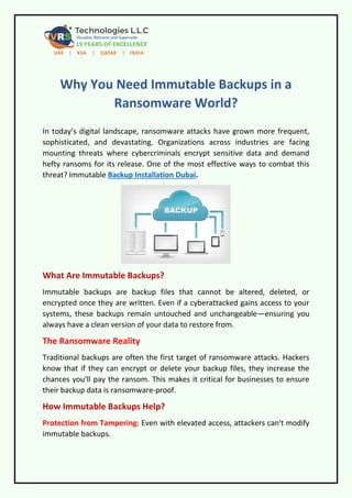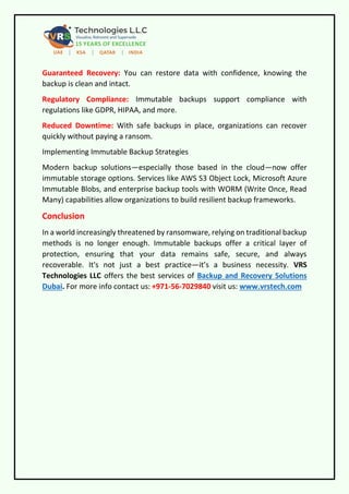 In this PDF, Protect your data from ransomware with immutable backups—secure, unchangeable, and recoverable. VRS Technologies LLC offers the most saturated services of Backup Installation Dubai. For more info Contact us: +971-56-7029840 visit us: https://www.vrstech.com/backup-and-recovery-solutions-dubai.html