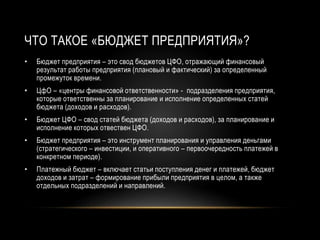 Интернет-конференция, проведенная 10 мая 2018 года, обсуждает важность бюджета предприятия как инструмента финансового планирования и управления. В документе рассматриваются различные аспекты бюджетирования, включая составление, анализ и корректировку бюджетных планов, а также роль центров финансовой ответственности. Также представлены онлайн-тренинги по разработке и внедрению бюджетной модели на основе практических консультаций.