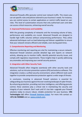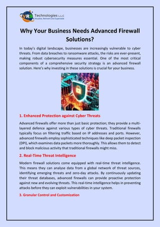 The document emphasizes the importance of advanced firewall solutions for businesses to protect against increasing cyber threats such as data breaches and ransomware attacks. It highlights key benefits, including enhanced protection through multi-layered defense, real-time threat intelligence, and granular control over network traffic. Additionally, advanced firewalls improve performance, offer comprehensive reporting, and can integrate with other security tools, making them crucial for maintaining network security.