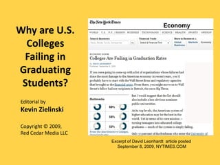 The document summarizes an article from the New York Times about low college graduation rates in the US. It notes that only 50% of US students complete a bachelor's degree, and cites potential causes like inadequate pre-college education, colleges prioritizing enrollment over completion, and lower-income students attending lower-quality schools. It also provides suggestions to address the problem, such as making education more affordable and changing cultural perceptions about the acceptability of dropping out.