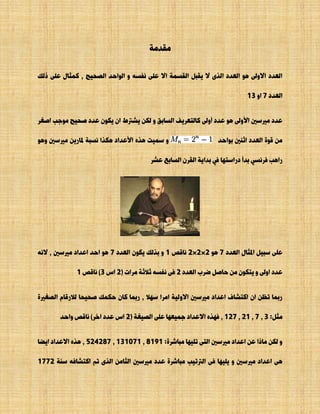 يتناول البحث عن أعداد مريسني الأولية، وهي أعداد أولية تكون على شكل (2^p)-1، حيث p عدد صحيح موجب. تم اكتشاف 12 عددًا حتى الآن، منها 10 بالأبحاث اليدوية و20 باستخدام الحاسوب، مشيرًا إلى مشروع البحث الكبير عن أعداد مريسني عبر الإنترنت (GIMPS) الذي يمكن الناس من المشاركة في البحث عن هذه الأعداد. يوفر المشروع فرصًا للتنافس والجوائز المالية، ويعزز الثقافة العلمية في المجتمعات المشاركة.