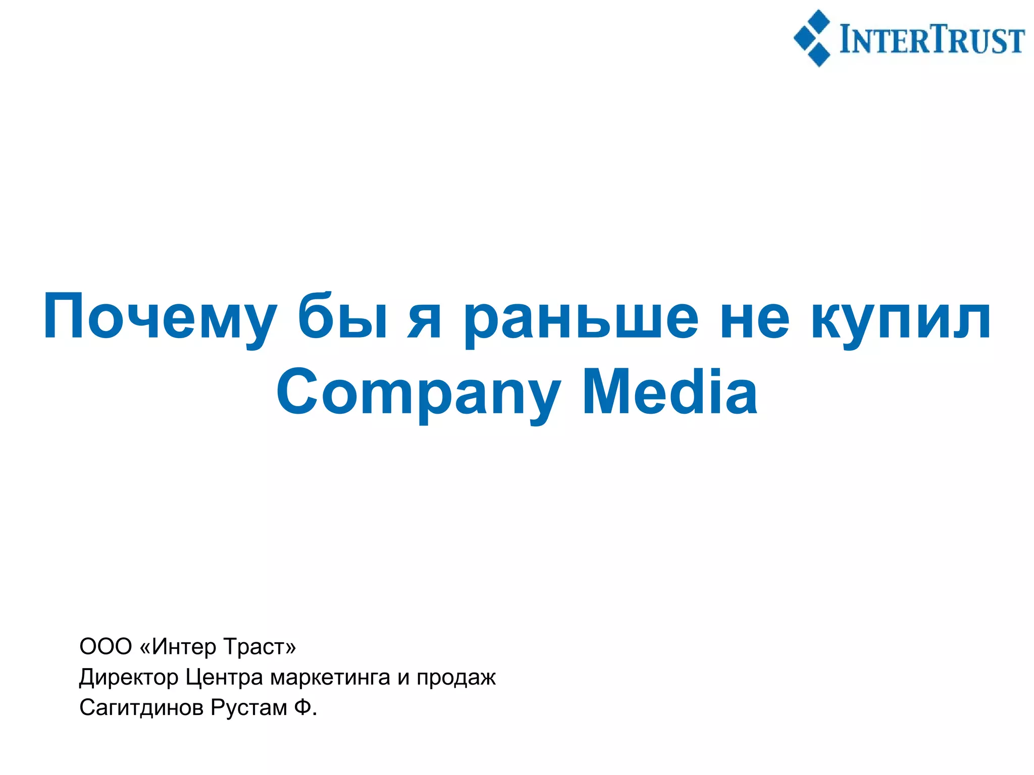 Документ описывает необходимость управления документооборотом и эффективностью ежедневной работы в дистрибуции, поставке оборудования и сервисном обслуживании. Основное предложение заключается в внедрении концепции case-менеджмента, которая повышает личную эффективность сотрудников и улучшает бизнес-процессы. Цель состоит в расширении применения программы company media для упрощения управления делами и автоматизации рабочих процессов.