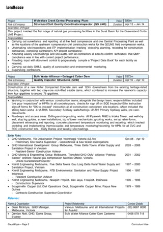 Gary Whyte has over 45 years of experience in the construction industry, having worked in roles such as logistics supervisor, quality improvement officer, and quality inspector on infrastructure projects across Australia, Vietnam, Indonesia, and Papua New Guinea. He has extensive experience coordinating logistics and deliveries, carrying out quality inspections, and mentoring younger engineers. His most recent roles have involved supervising pre-cast deliveries for bridge projects in New South Wales and quality inspection work on a gas processing plant and enlarged dam in Queensland.