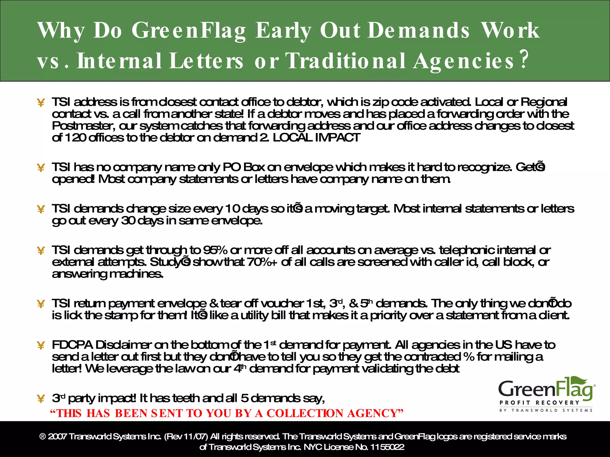 TSI demands are more effective than internal letters or traditional collection agencies for three reasons: 1. TSI addresses demands to the debtor's closest contact office based on zip code, making it feel more local and urgent than a letter from out of state. 2. TSI envelopes do not include the company name, making the demands seem more anonymous and thus more likely to be opened. 3. TSI demands change size every 10 days, keeping debtors guessing, while internal letters typically remain the same size and are sent less frequently. On average, TSI demands result in payment from 95% of accounts, higher than telephonic attempts.