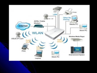 Wi-fi is a wireless networking technology that uses radio signals to transmit and receive data over short distances without wires. It uses the 802.11 standard developed by IEEE and allows devices to connect to a local area network (LAN) without cables. Key advantages include lower costs than wired networks and the ability to setup networks in places where cables cannot reach. However, wi-fi performance can degrade due to interference from other devices and it has limited range compared to wired connections. Security is also a concern, though encryption methods provide some protection.