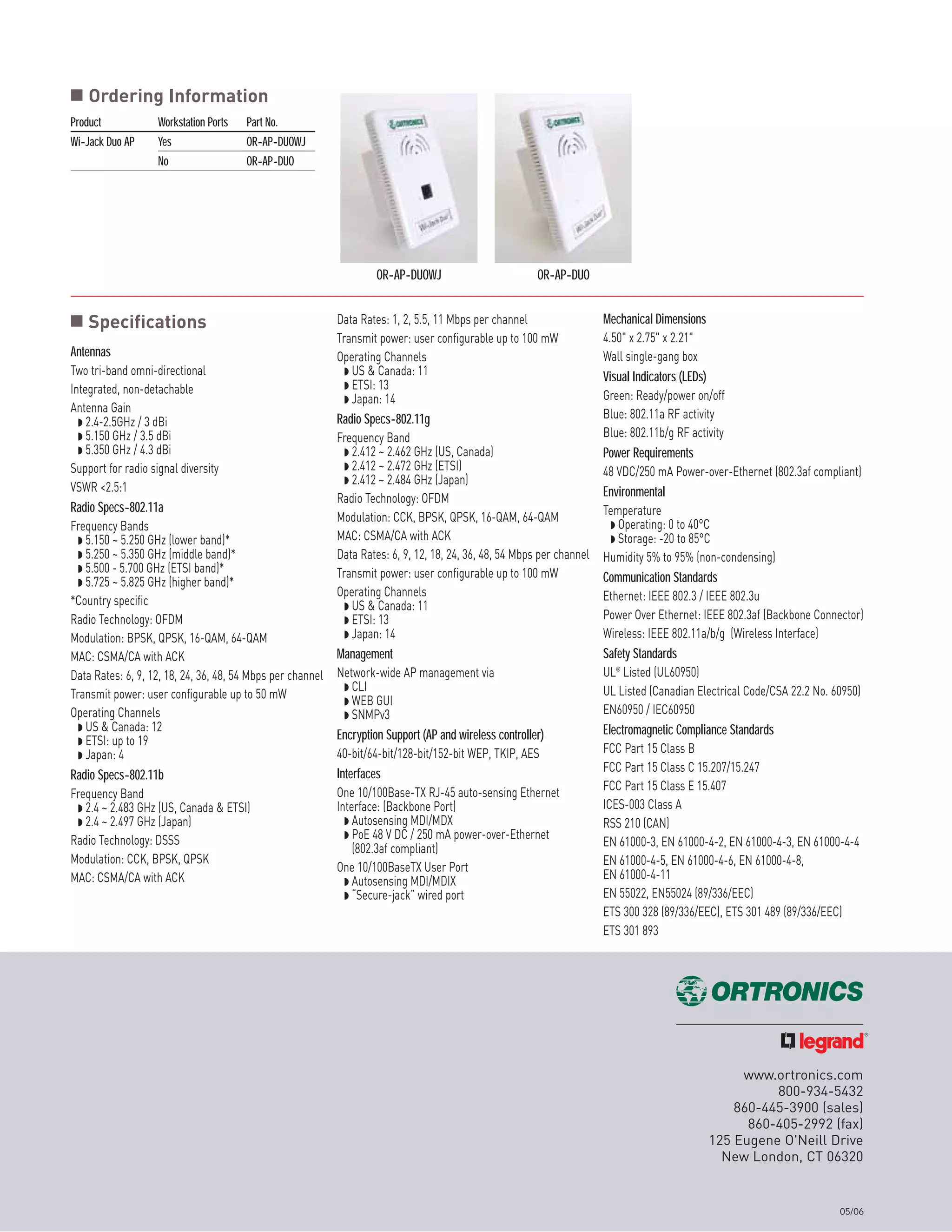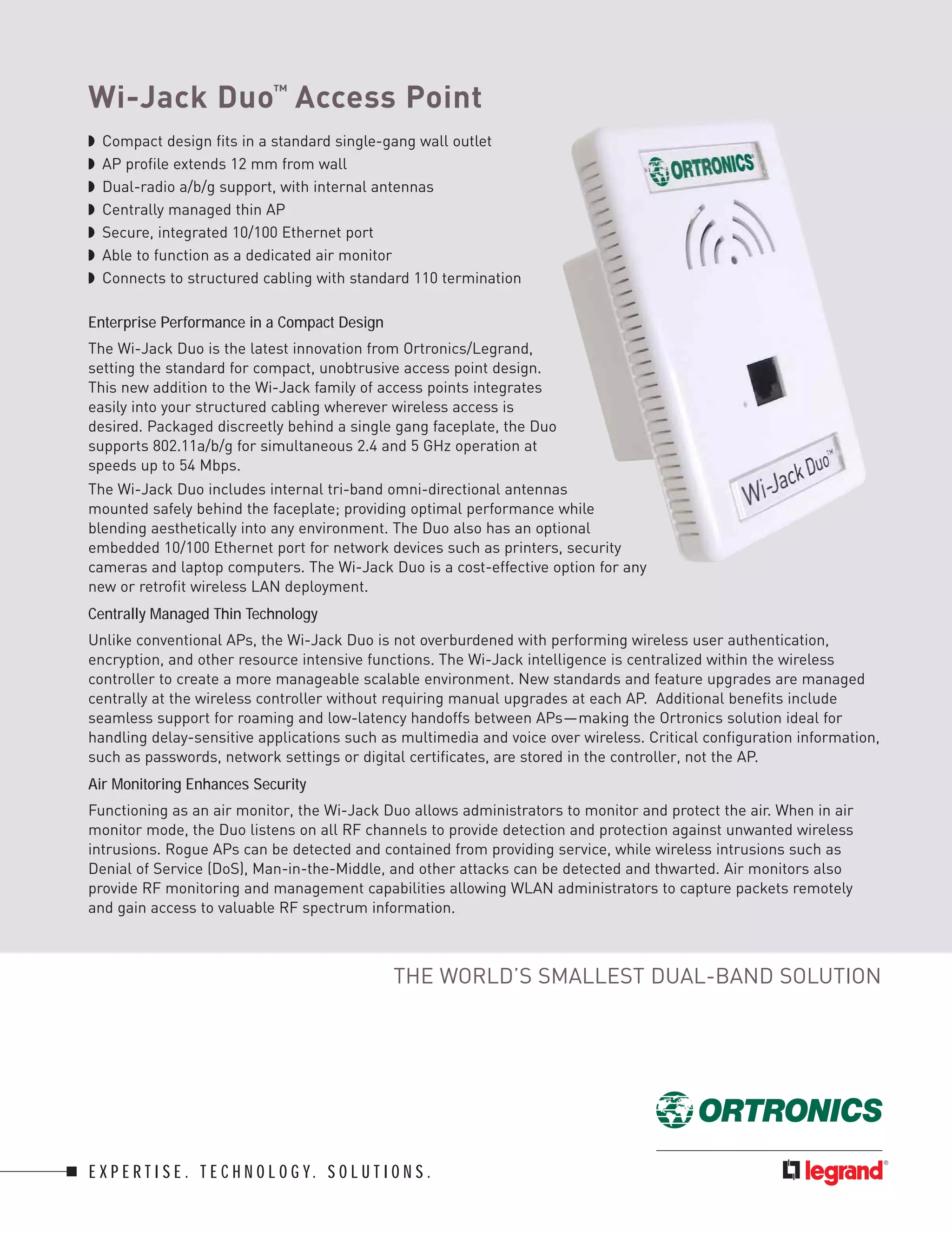 The Wi-Jack Duo is a compact dual-band wireless access point that fits into a standard wall outlet. It supports 802.11a/b/g wireless connectivity and has internal antennas. As a centrally managed thin access point, it has limited onboard processing and relies on a wireless controller for management of wireless users, encryption, and upgrades. It can also function as a wireless intrusion monitor to detect rogue access points or attacks.